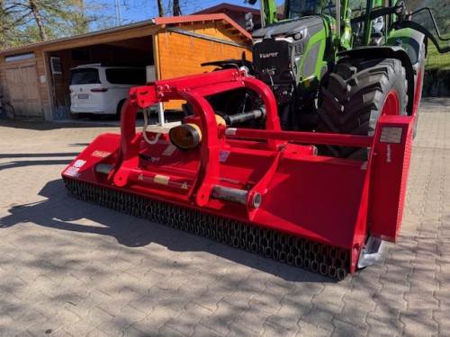 Extrem flexibel: Parallelogramm-Verschiebung. Einsatzwinkel von 90 Grad nach oben bis 60 Grad nach unten möglich. Kann hinter oder weit neben dem Schlepper gefahren werden. Auch Äste von Bäumen z. B. an Waldrändern, Hecken, Einfriedungen können waagerecht oder bis 90 Grad senkrecht weggemulcht werden. Verstärktes Chassis mit Stahlketten-Vorhang (Sonderwunsch) statt beschädigungsintensiven Blechklappen. Doppelte Gegenschneide für optimale Zerkleinerung. Hydraulische und mechanische Anfahrsicherung zum Schutz bei Hindernissen. Hydropneumatischer Stoßdämpfer Arbeitsbreite: 2,60 m/ Gesamtbreite 3,10 m (wir haben auch noch einen mit 2,80m Arbeitsbreite. Gesamtbreite ca. 3,30 m, Einsatz 2024) Werkzeuge: 56 schwere selbstschärfende Hammerschlegel auf extrem laufruhigem douple Tool-Dual-Rotor. Rotor: Ø 430 mm, schnelllaufend für sauberes Schnittbild bei Holz bis zu 12 cm. inkl. integriertem Freilauf. maximale Reichweite nach außen Zentralschmierung und automatische Riemenspannung OMARV ist ein spezialisierter Familienbetrieb aus Norditalien, der ausschließlich Mulcher baut. Die Maschinen sind bekannt für ihre enorme Sogwirkung und den ungeschlagenen Wirkungsgrad und Leichtläufigkeit (Bis 50% Kraftstoffersparnis!). Wir sind mit einem 100PS Schlepper gleichzeitig mit beiden Mulchern gefahren.